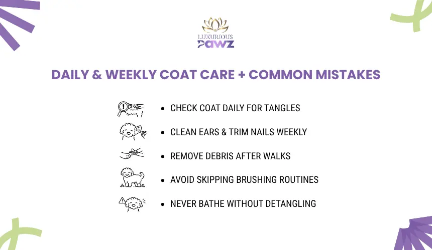 Daily checks help prevent small tangles from turning into mats. Keeping the coat clean and free of debris reduces irritation and makes grooming easier. It also allows you to spot early signs of skin issues, ensuring timely care before they become more serious problems.