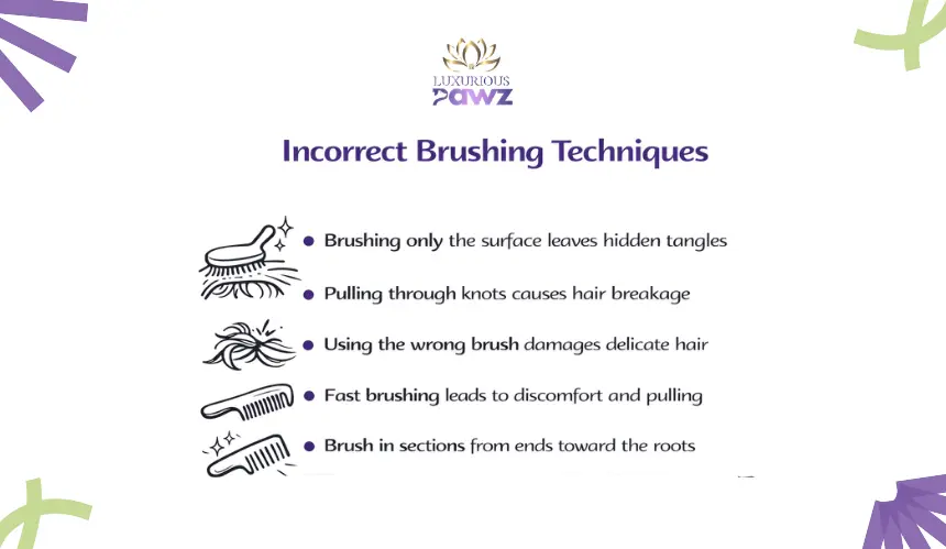 Brushing only the surface layer | Tangles close to the skin remain untreated and eventually form mats | Divide the coat into sections and brush from the roots outward |