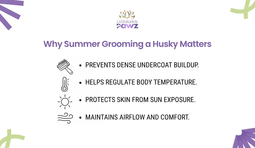 A Husky’s coat is not only for warmth. It also helps regulate body temperature, protects the skin from direct sun exposure, and acts as a barrier against dirt and environmental debris. In summer, the goal is not to remove that coat but to keep it functioning properly by clearing out loose undercoat and maintaining good airflow through the fur.