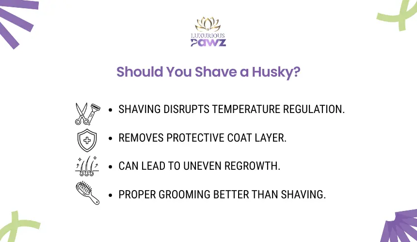 No, shaving a Husky in summer is generally not recommended. A Husky’s double coat is part of a natural protective system, and removing it can interfere with how the coat regulates temperature and protects the skin.