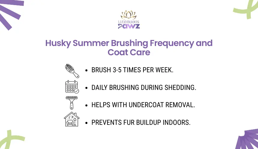 Most Huskies need more frequent brushing in summer, especially during heavy shedding. Several sessions a week are often helpful, and some dogs may need near-daily grooming during peak coat blow.