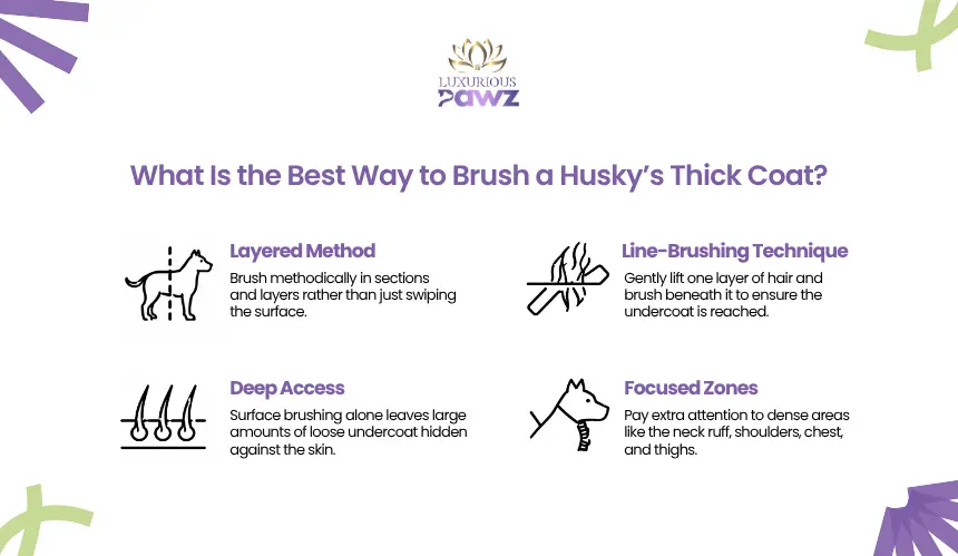The best way to brush a Husky is to work in layers, moving methodically through the coat instead of brushing only the surface. Surface brushing may make the coat look tidy, but it often leaves large amounts of loose undercoat hidden underneath.
