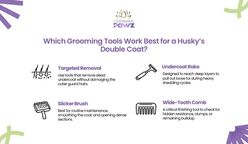 The best grooming tools for a Husky are the ones that remove loose undercoat without damaging the outer guard hairs. Not every brush labeled for shedding is appropriate for a heavy functional double coat.