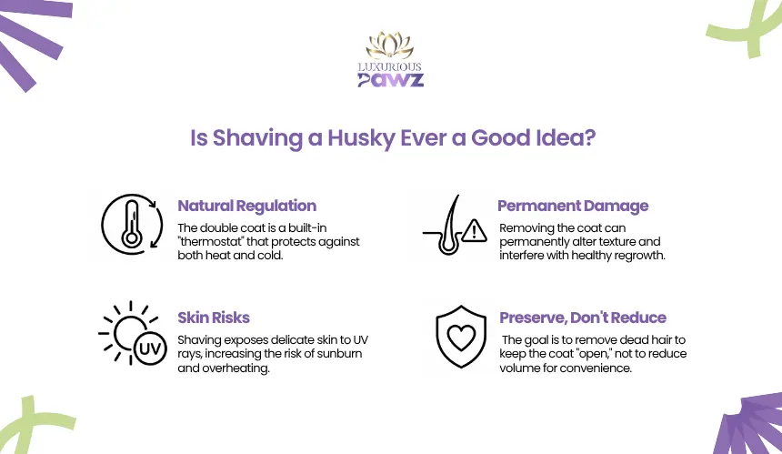 In most cases, shaving a Husky is not recommended. A double coat is not simply extra fur that makes the dog hot. It is part of the dog’s natural temperature regulation and environmental protection system.