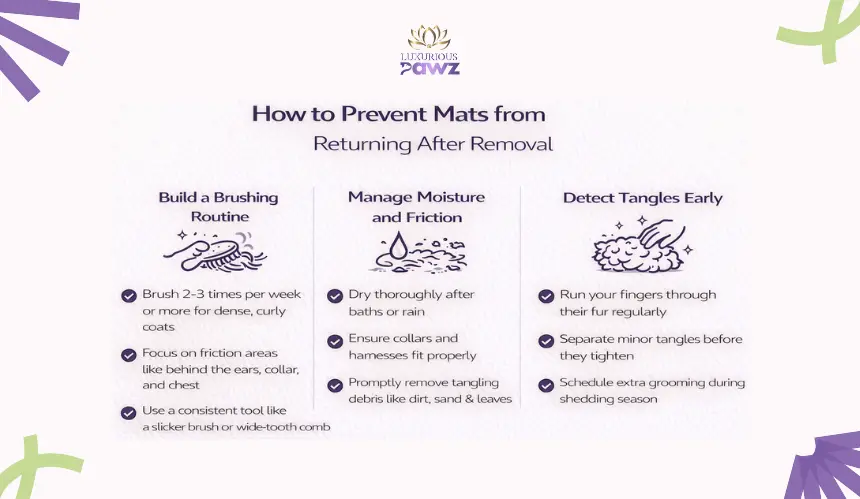 Once mats are safely removed, prevention becomes the most important part of coat care. Preventing matting is less stressful than correcting it and helps maintain both comfort and coat health. Effective prevention focuses on consistency, friction control, and early detection rather than occasional intensive grooming.