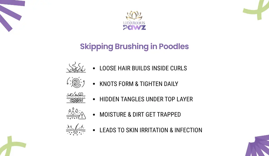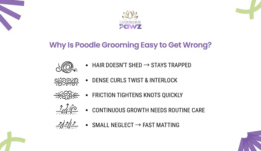 Poodle coats require specific handling due to their unique structure. Without understanding how the coat behaves, even well-intended grooming routines can lead to tangling, matting, and coat damage.