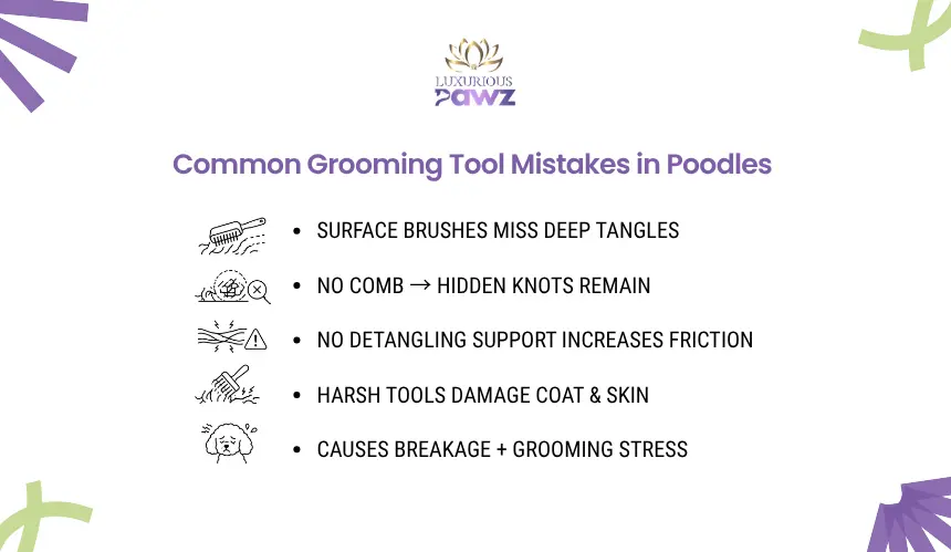 Using the wrong grooming tools can make brushing ineffective, even if done regularly. Poodle coats are dense and layered, so tools must reach beyond the surface to properly remove tangles and maintain coat health.
