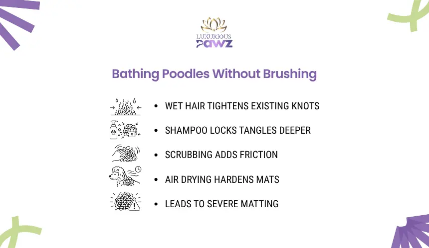 Bathing a Poodle without proper pre-brushing is one of the most common grooming errors. Water and movement change how the coat behaves, and any existing tangles quickly become more severe. What may seem like a minor knot before a bath can turn into a tight, unmanageable mat afterward.