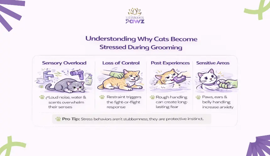 If a cat bolts under the bed the moment the carrier appears, that reaction is not stubbornness. It is a stress response. Grooming introduces unfamiliar handling, new environments, and close physical contact, all of which can trigger anxiety in even the calmest feline.