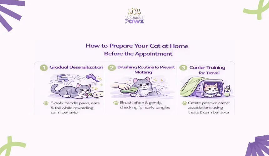 Preparation begins long before the grooming table. A cat that feels secure at home is more likely to tolerate handling in an unfamiliar environment.