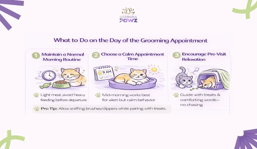 The grooming day should feel calm and predictable, not rushed or chaotic. Cats are highly sensitive to changes in routine, and even subtle tension from their owner can influence their behavior. A structured, low-stimulation approach keeps stress levels manageable and supports smoother handling at the salon or mobile unit.