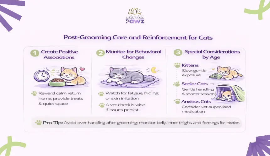 Post-groom monitoring protects both physical health and emotional stability. When owners respond thoughtfully after each session, cats are less likely to develop escalating grooming anxiety over time.