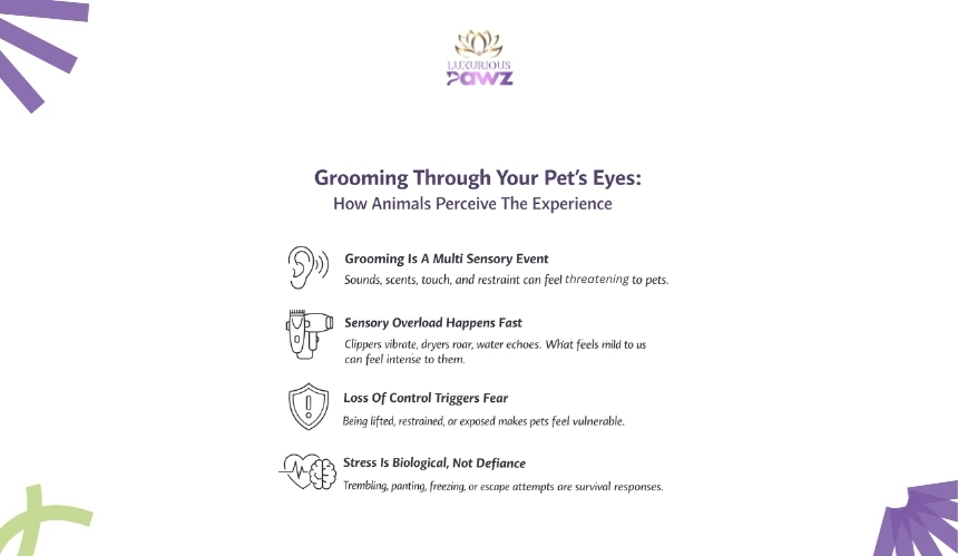 Many pets experience grooming as a form of sensory overstimulation. Electric clippers produce high-frequency vibrations. Running water echoes in enclosed spaces. Dryers create intense airflow and noise. Even strong shampoo fragrances can overwhelm animals with heightened olfactory sensitivity.