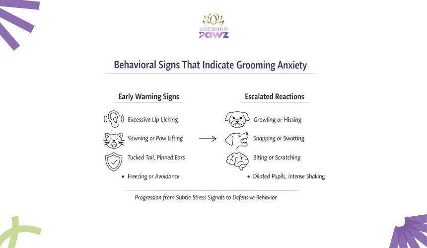 Resistance during grooming rarely appears without warning. Most pets communicate discomfort long before behavior escalates into snapping or hiding. The challenge is that these signals are subtle and often misread as stubbornness or impatience. In reality, they are measurable stress responses tied to neurological activation and emotional discomfort.
